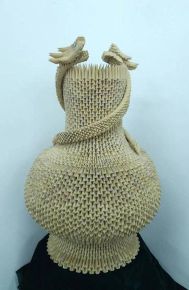 紙?zhí)兆髌贰侗P(pán)龍瓶》是由廢棄的盲文紙折成一個(gè)個(gè)小小的三角片插接而成。作品高65 厘米,直徑45 厘米,由6500 多個(gè)三角片插接而成。龍是中華民族的象征,也是一種精神和凝聚力的象征,意義非凡。作品將紙?zhí)账囆g(shù)與中華文化結(jié)合,寓意雙龍呈祥,福運(yùn)雙至,富貴安康,向上騰飛。