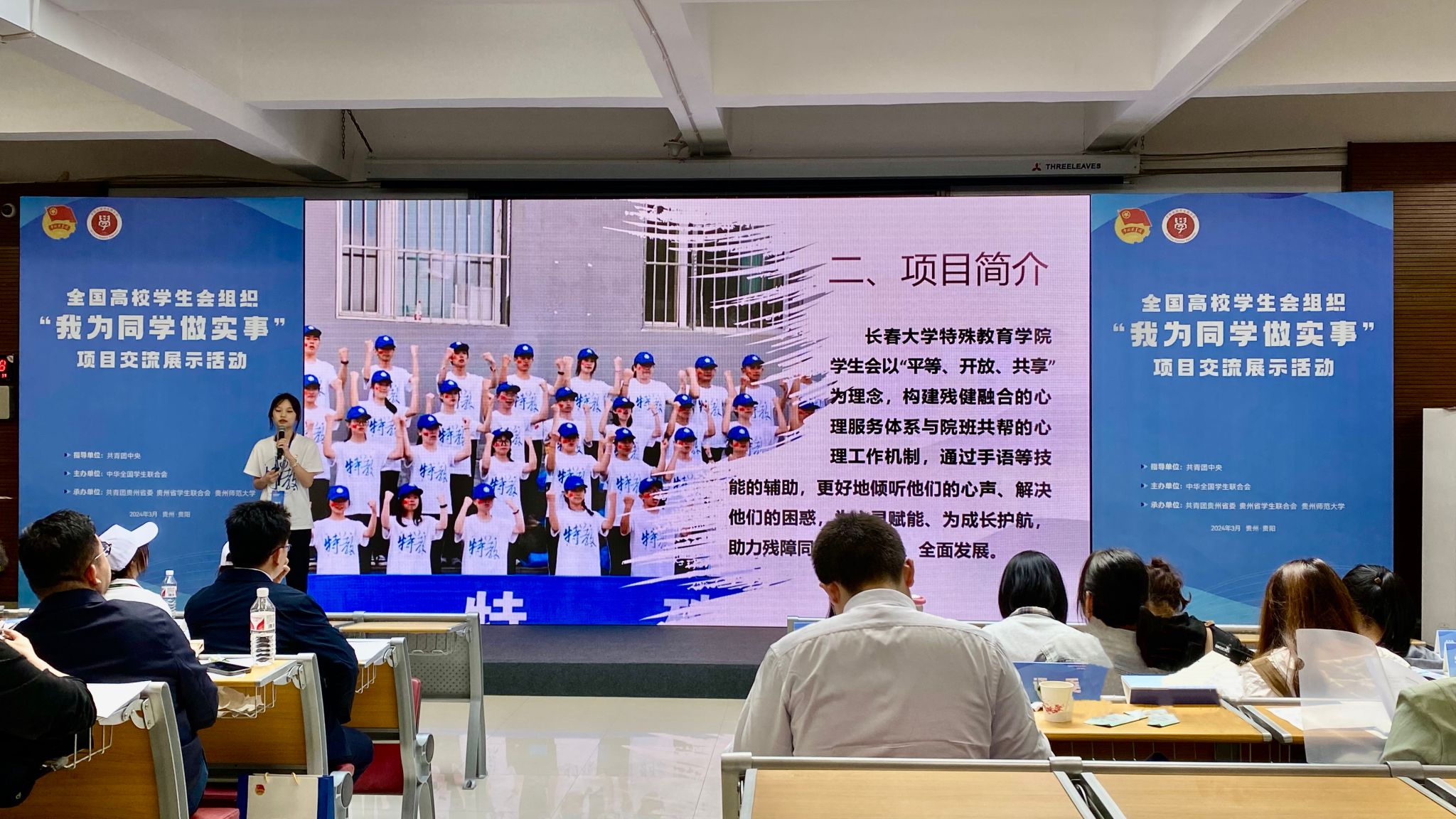 3月23—24日,由共青團中央指導,全國學聯主辦,團貴州省委、貴州省學聯、貴州師范大學承辦“我為同學做實事”項目交流展示活動在貴陽舉行,活動主題為“學思想·做實事·樹新風”,團中央書記處第一書記阿東出席活動現場。我校特殊教育學院學生會項目“‘心’福你我相伴——同學心理健康幫扶項目”被評為“精品項目”“最受同學歡迎項目”,是吉林省高校中獲得兩項榮譽的唯一高校。