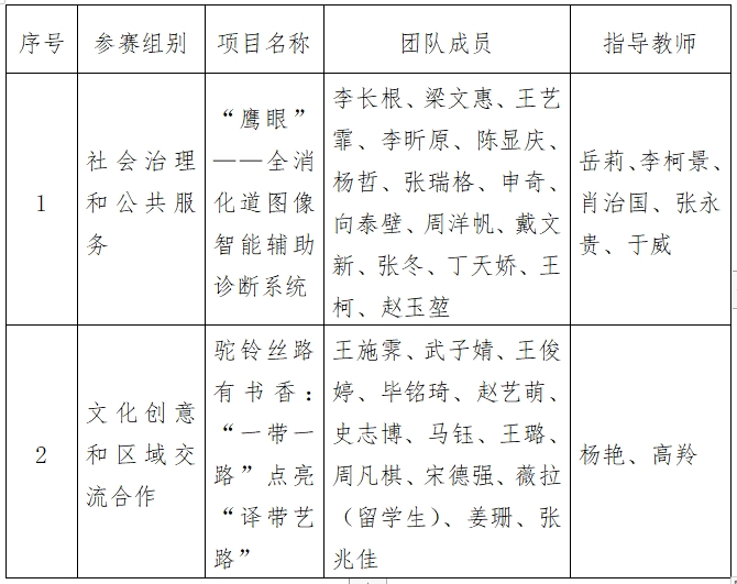 經校賽、省賽選拔,我校推報《“鷹眼”—全消化道圖像智能輔助診斷系統》《駝鈴絲路有書香:“一帶一路”點亮“譯帶藝路”》2個項目參加國賽具體信息公示如下:
