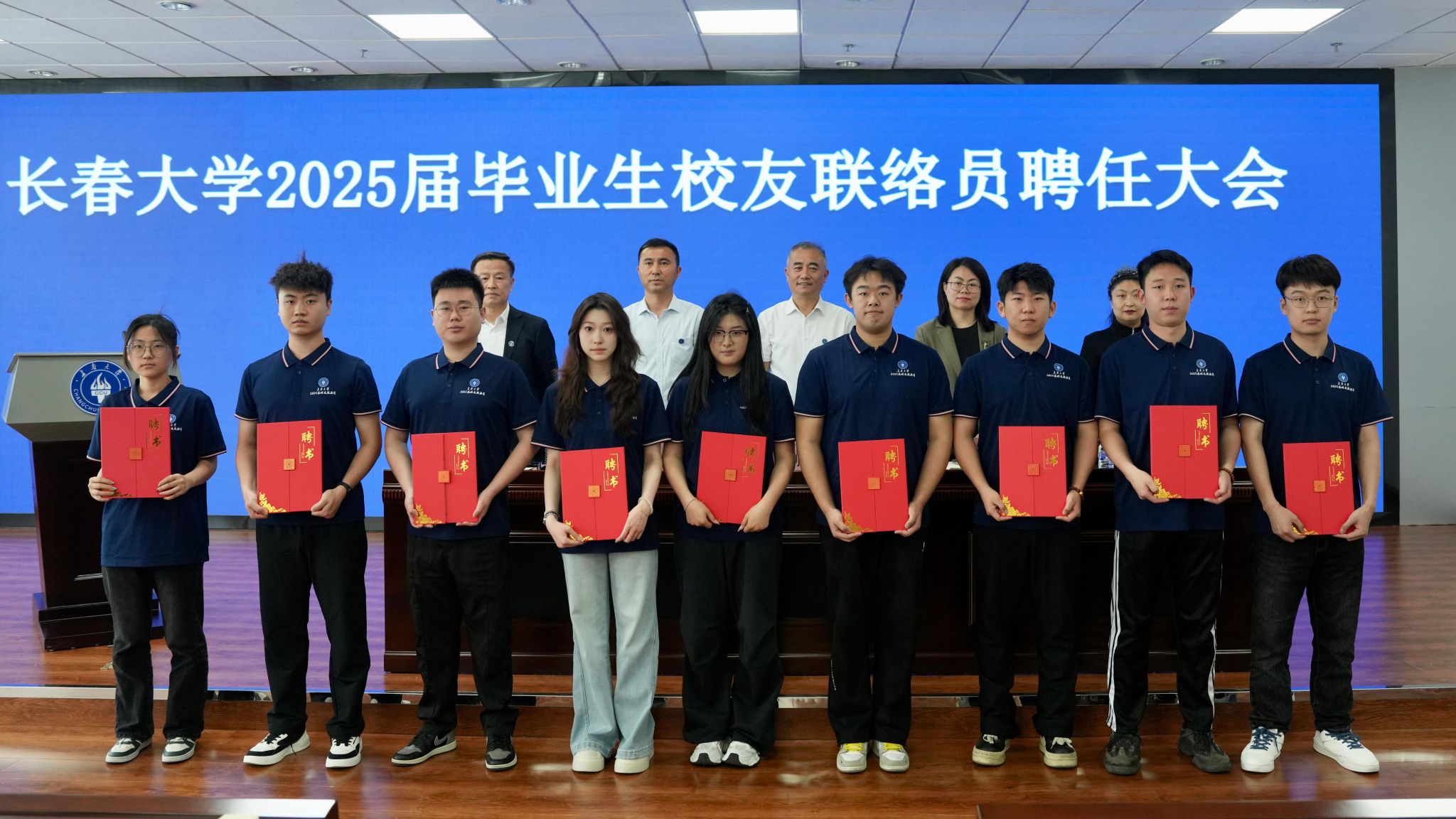 與會領(lǐng)導和高春光為2025屆畢業(yè)生校友聯(lián)絡(luò)員代表頒發(fā)聘書。